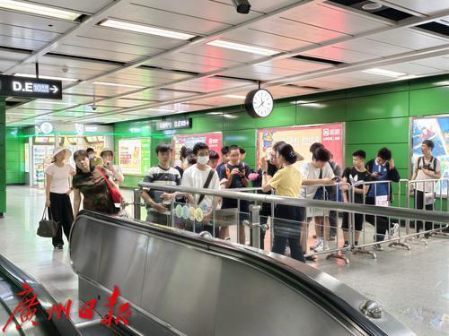 地铁十二号线白云文化广场站,乘客在排队购买纪念品。