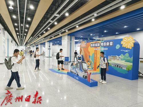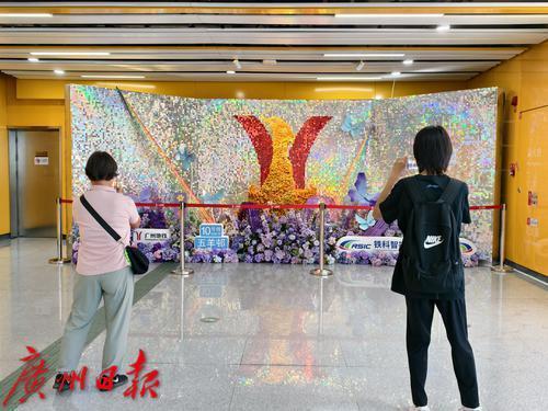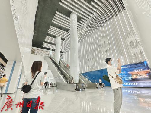 地铁十二号线广州白云站,乘客在站厅展示墙前打卡拍照。