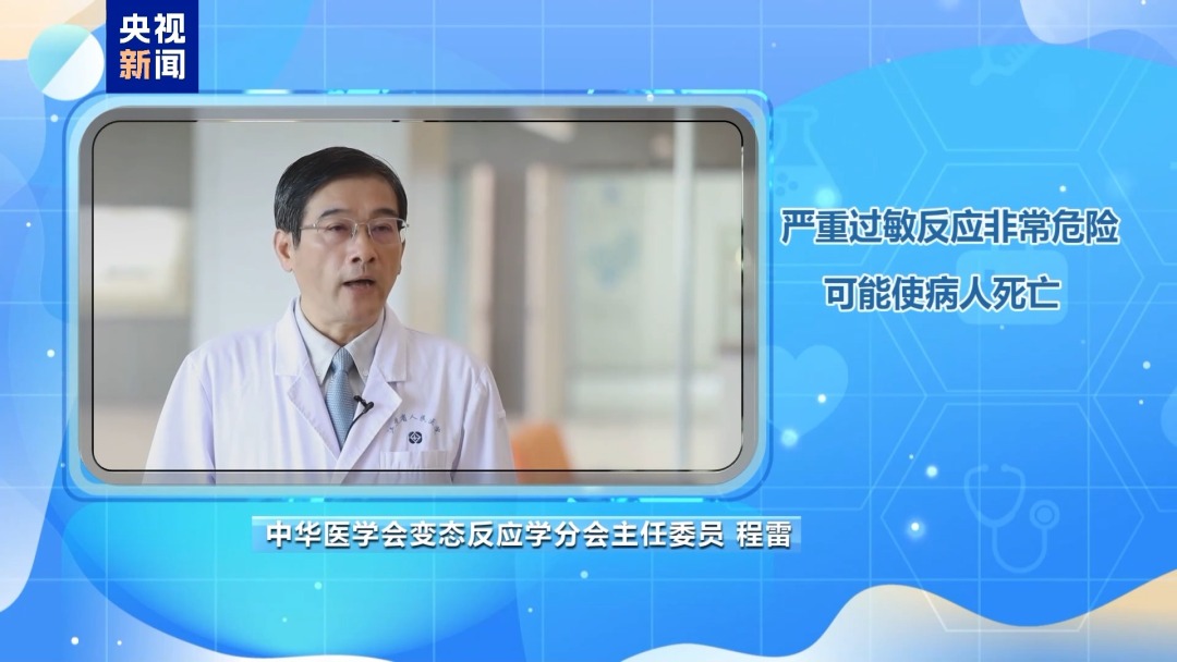中华医学会变态反应学分会主任委员 程雷:严重过敏反应是一种非常危险的疾病,可能使病人死亡。发生严重过敏反应的原因主要还是食物过敏和药物过敏,这种速发型的变态反应,发展速度非常快。
