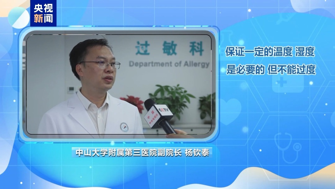 中山大学附属第三医院副院长 杨钦泰:保证一定的温度和湿度是必要的,但是不能过度。温度过低,往往会刺激呼吸道,导致过敏性鼻炎和哮喘。湿度太低,皮肤太干燥,往往会导致皮肤过敏性疾病,太高和太低都不行。