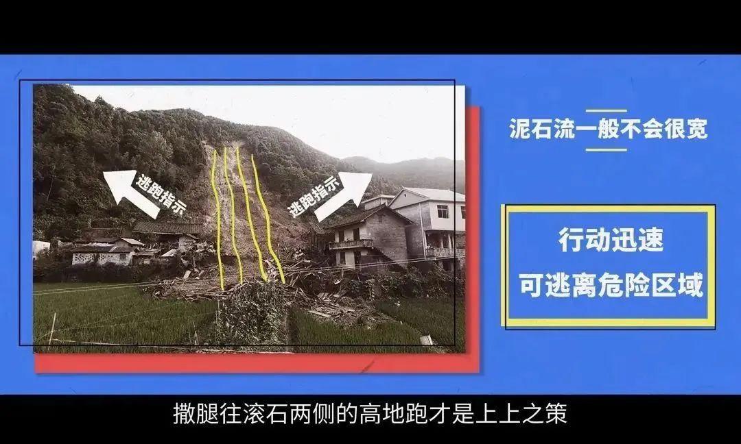若突遇泥石流、山体滑坡,不要顺着河沟方向往上游或下游跑,应向与洪流方向垂直的两边山坡上爬。