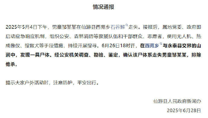 6月28日晚,福建省莆田市仙游县人民政府新闻办发布情况通报,确认该男童已遇难。