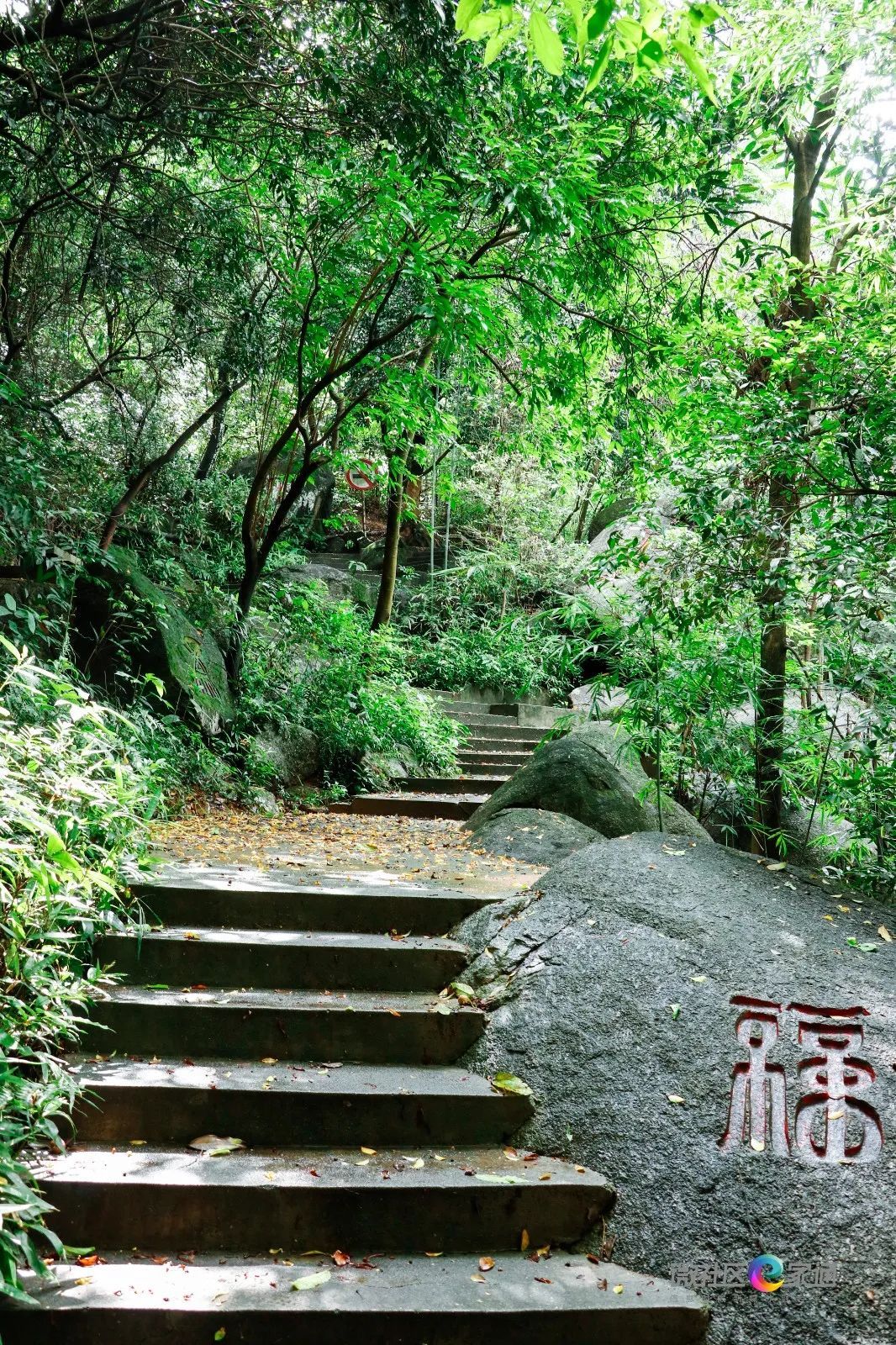 再往景区深处走,沿着山间小径的石阶拾级而上,一路且行且赏。尤其春夏季节,雨水多发,雨过天晴后,阳光透过竹叶斑驳地照射下来,游人徐行漫步在山间,颇有“绿竹入幽径,青萝拂行衣”的意境。