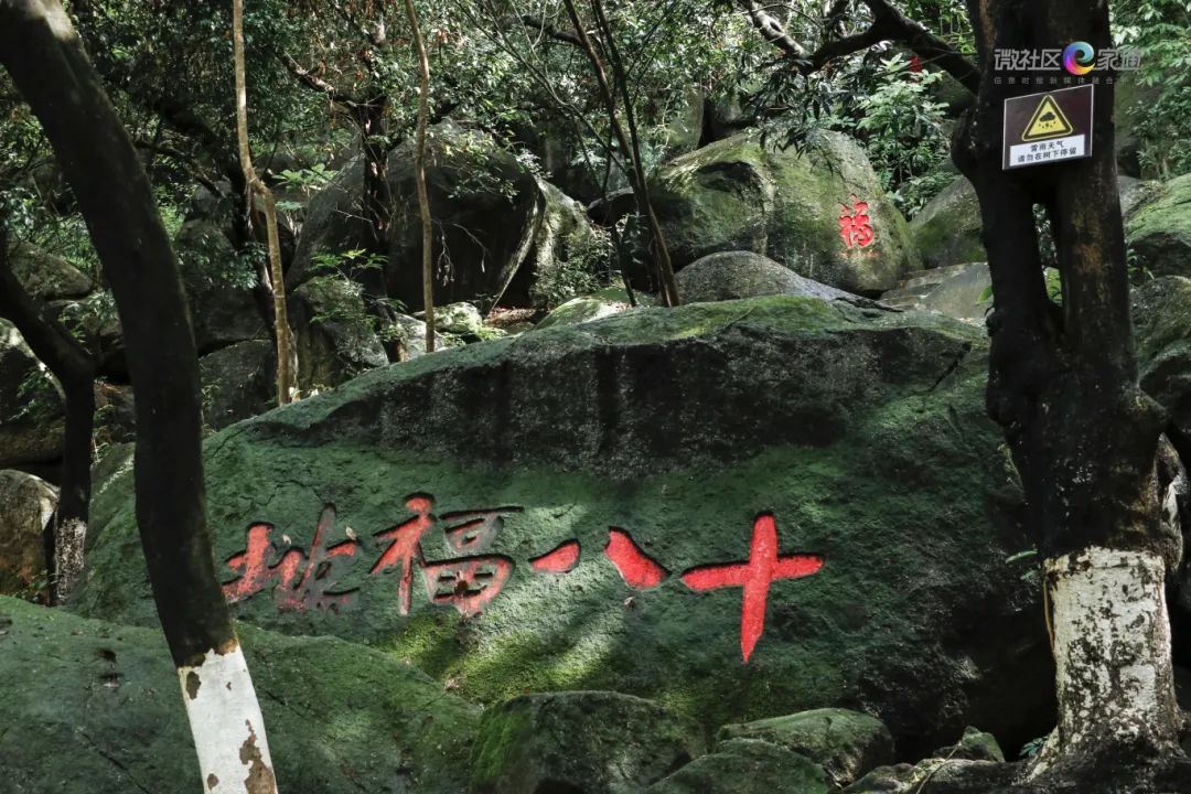 行进的路上,可以发现路旁许多石头上雕刻有“福”字,此处便是“十八福地”。相传丹水坑的“十八福地”是天官降福之处,内中雕有十八个“福”字、八只“蝙蝠”和一个“禄”字。游人进入其间,找齐十八个“福”字、八只“蝙蝠”和一个“禄”字,寓意与福有缘、瑞福进宅。