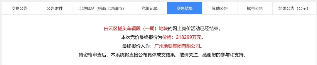 在6月30日土拍之中,白云区槎头车辆段一期地块以218299万元的总价顺利出让,竞得者为广州地铁,楼面地价1.9万元/平方米。