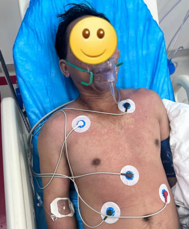 “当时没太在意,继续干活,没想到不一会就感觉喘不上来气。”工友赶紧将黄先生送到附近诊所,此时黄先生的血压下降明显,血压波动60-80/30-50mmHg,开始出现气促、呼吸困难、心悸、胸闷、恶心,甚至全身出现皮疹、红斑。