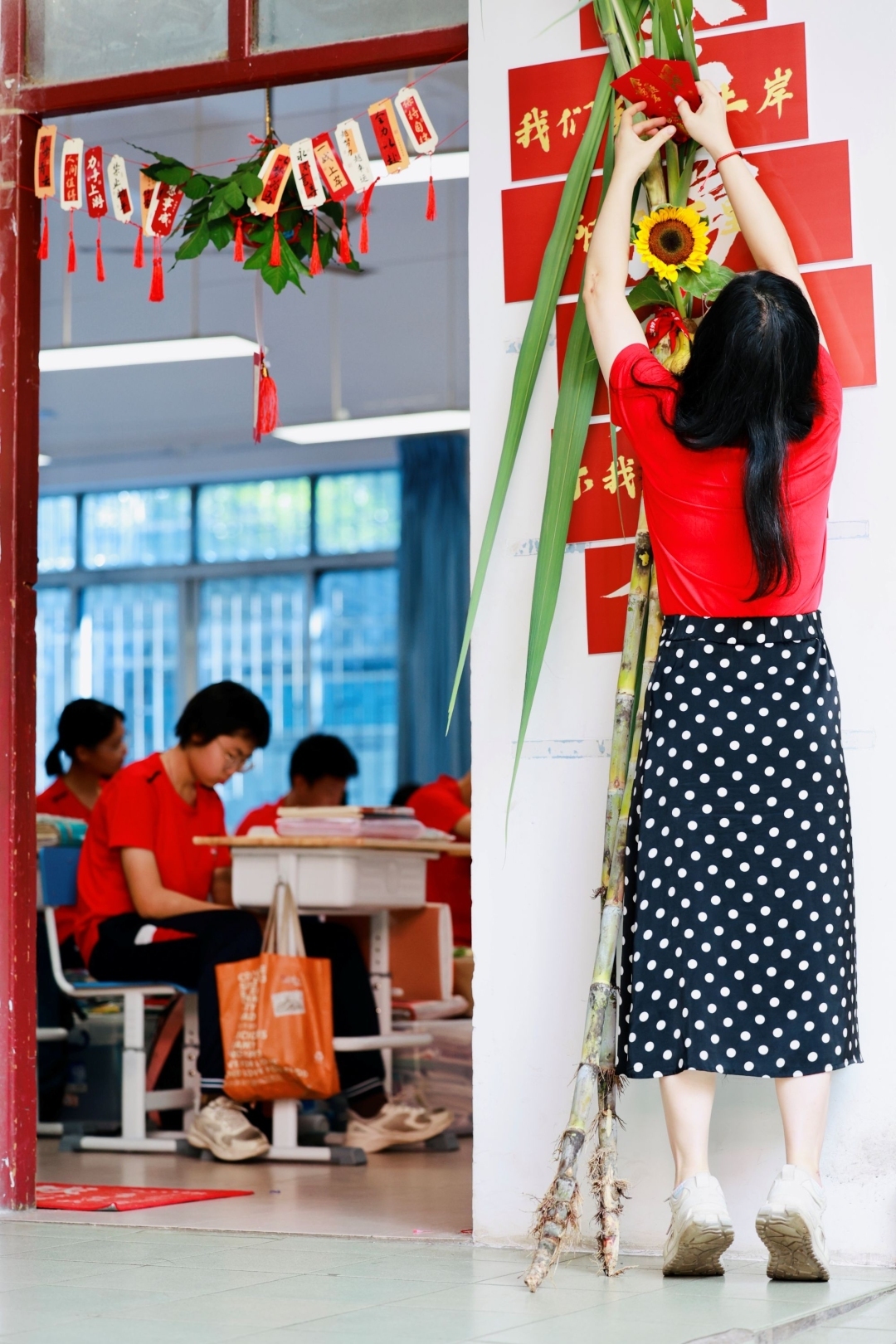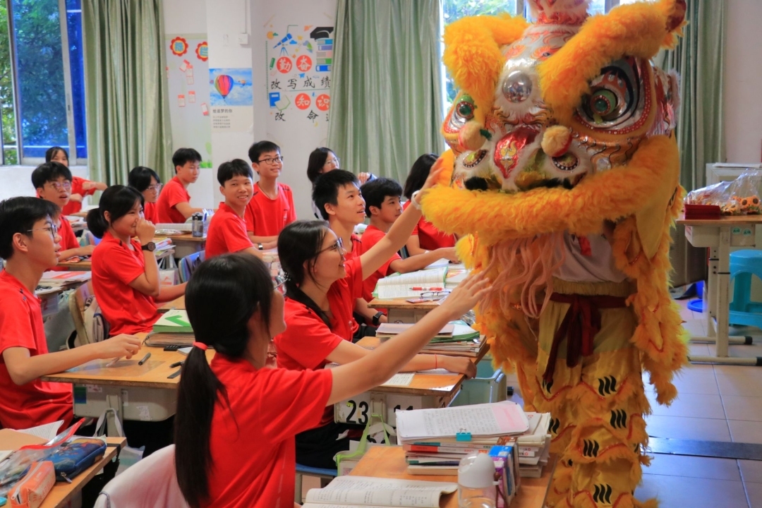 在禅城区南庄镇吉利中学,初三考生们带着全校的祝福,奔赴中考考场。当天上午,六只金红相间的醒狮跟着鼓点,摇头摆尾进入各班教室送来祝福。醒狮为各班班长递上写有“旗开得胜”“金榜题名”等祝福语的红色手幅,各班班主任也向学生派发中考祝福利是及精心准备的“福袋”,以实际行动传递“温暖陪伴”的心意。在必胜门前,初三学生整齐列队,各班班长接过班旗,高高举起,带领班级同学满怀信心走过必胜门。