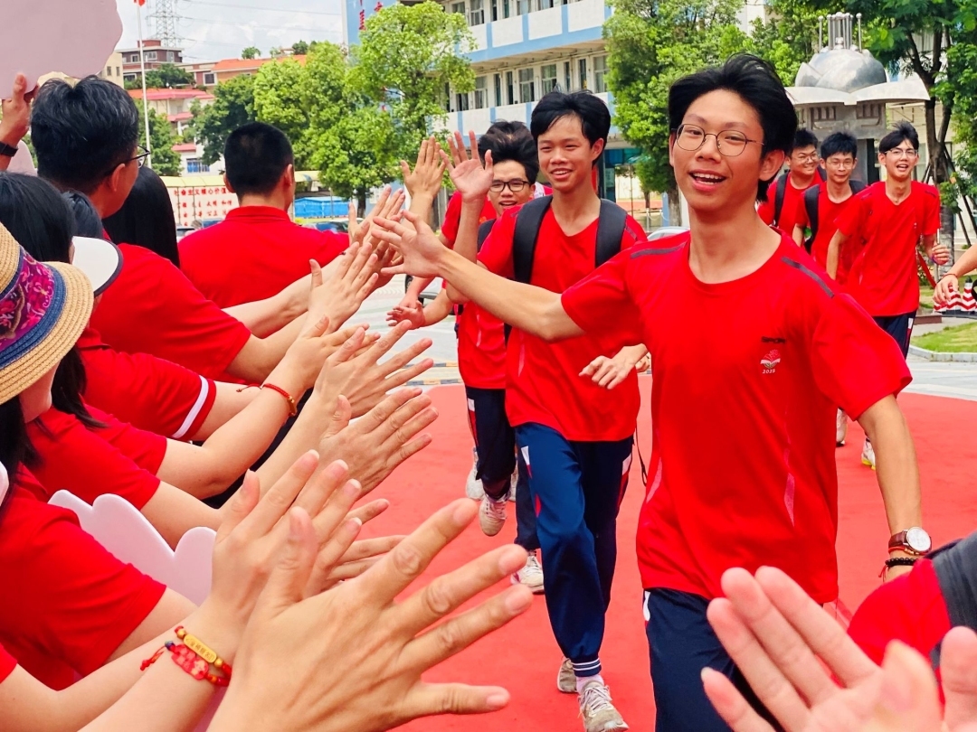 在佛山市荣山中学考点,来自城北中学等学校的考生乘坐送考大巴到达考点。考生们身穿寓意红红火火的红色上衣,自信地通过遮阳帐篷走进考点。