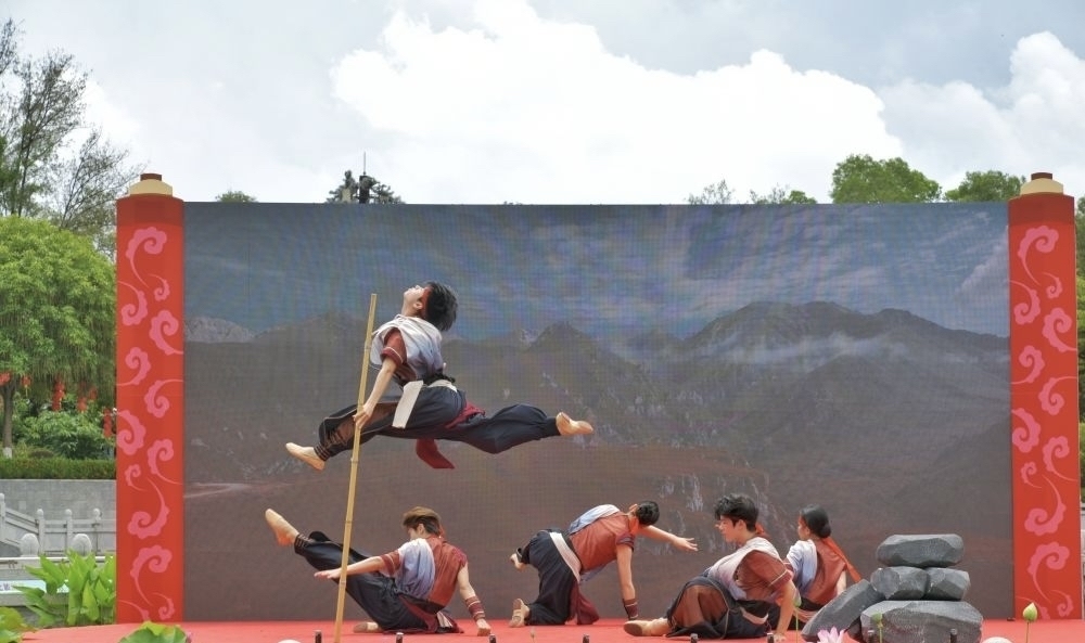 开幕式上,山水实景剧《石海千年·丝路莲舟》在莲花山仙境湖舞台上演。60余名专业舞者以雄浑之舞再现南越先民凿石开山的历史场景,在胡旋古乐中演绎波斯商船逐浪通航的商贸往来。
