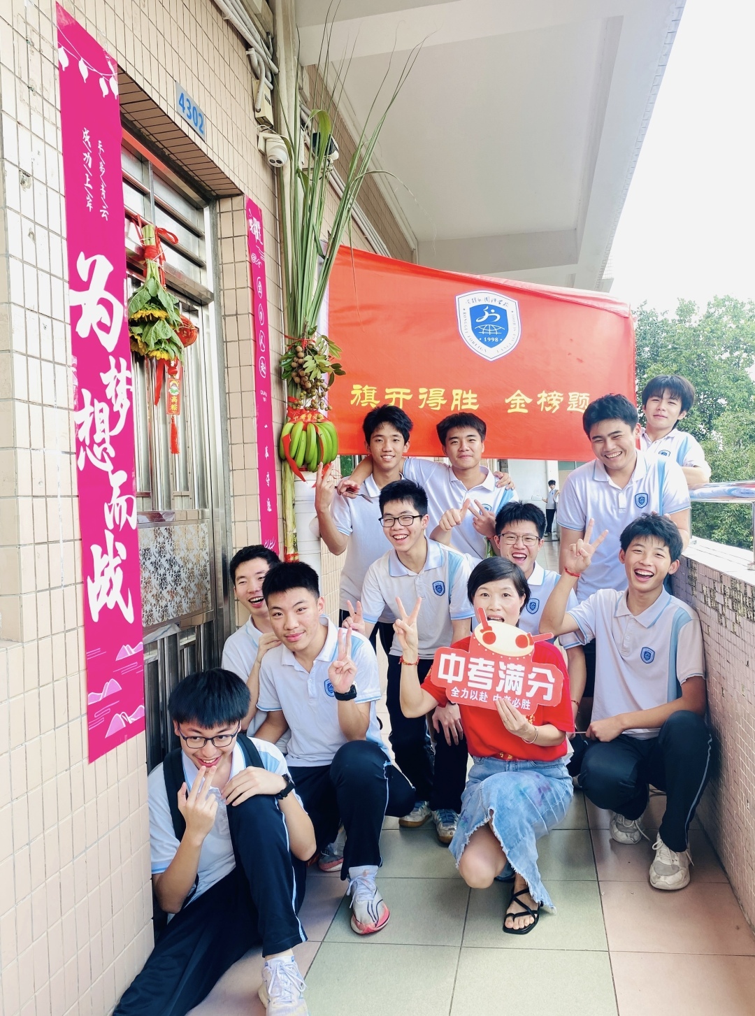 在位于顺德区容桂街道的容桂外国语学校,该校的送考仪式同样是热闹非凡。“考神附体,势不可挡!”“加油,你能行!”现场,老师们手捧精心准备的口号牌,同每一个考生打气。