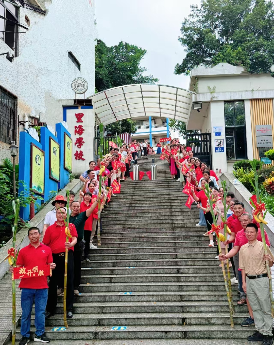 在龙江镇的里海学校,该校的“幸运击掌团”沿路而立,学校党支部书记、校长唐景斌带领老师们与每位即将赴考的考生击掌,传递鼓励。此外,还有不少家长穿着红色衣衫,在孩子经过时送上拥抱与叮嘱,眼神中满是关切,温暖话语激励学子继续前行。
