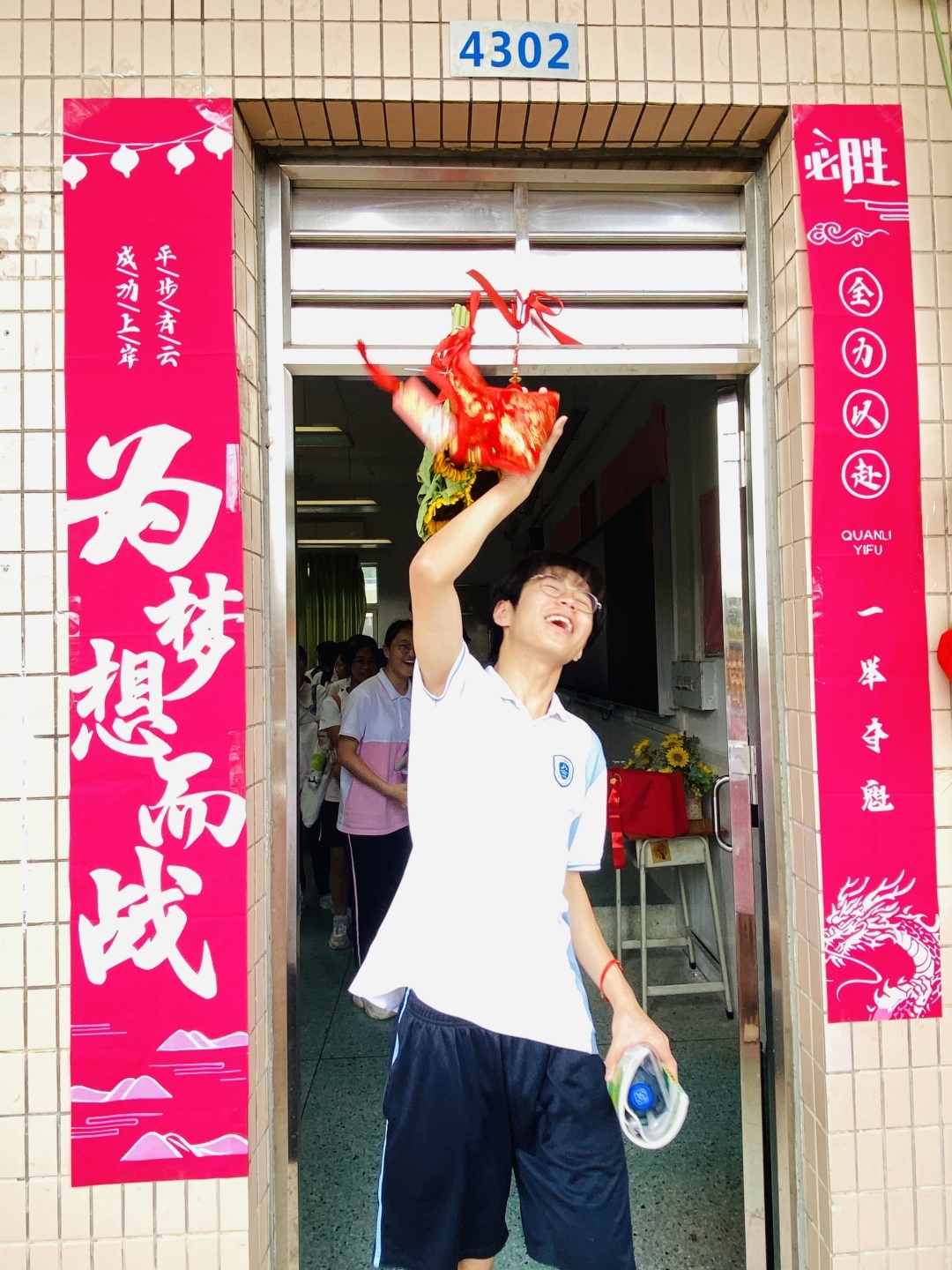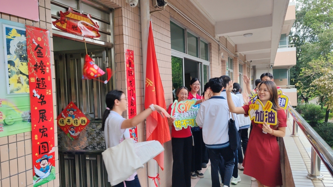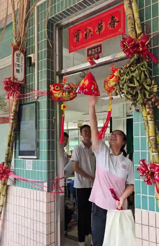 喜粽(高中)、锦鲤(好运)、甘蔗(掂过蔗碌)……在该校,还有初三班级用喜粽、锦鲤娃娃、甘蔗等象征美好祝愿的物件、水果一起装点喜庆的大门,可谓是“buff”叠满,为考生送上最暖心的祝福。
