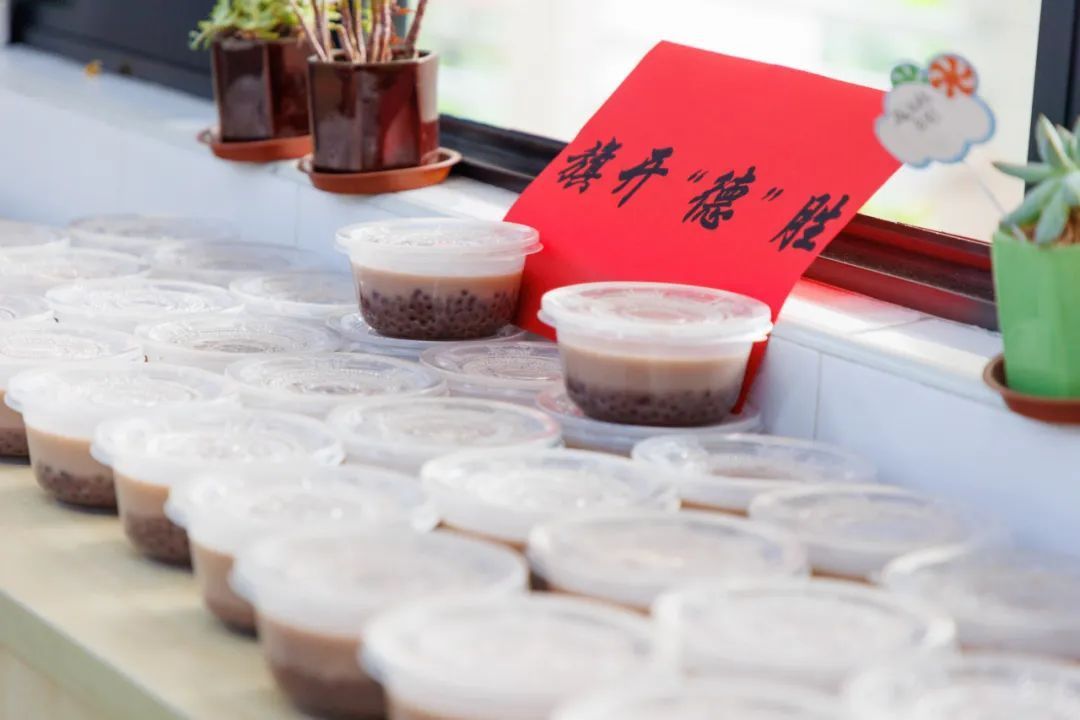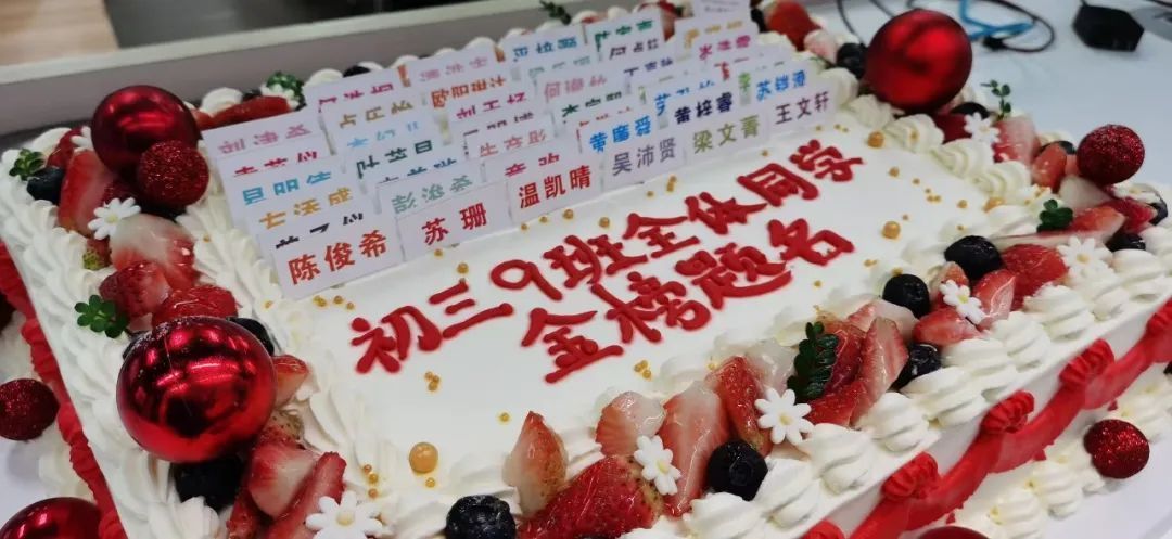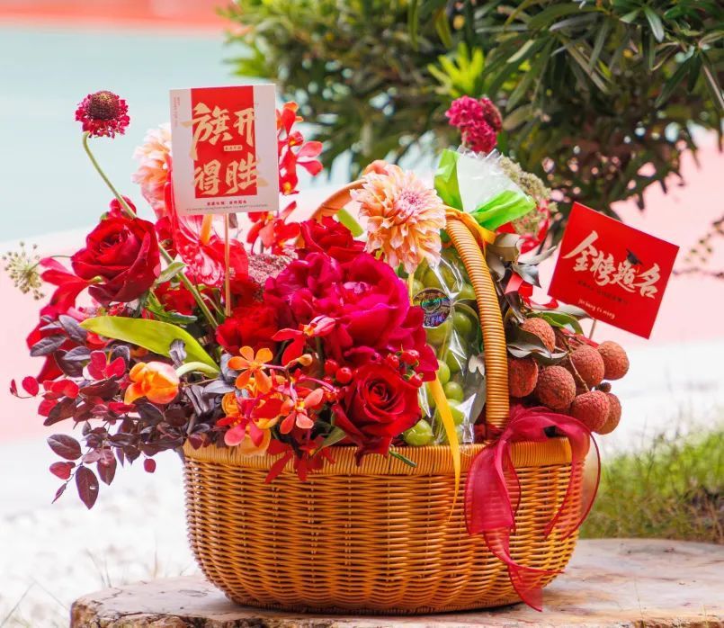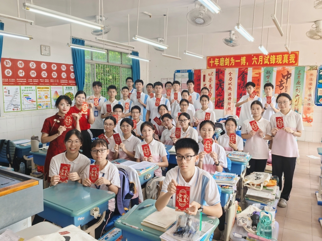 甜,是顺德德胜学校为考生送上的味蕾在祝福。该校校领导为初三考生送来满载祝福的暖心礼物——缀满火红花朵与硕果的花篮,一份份甜品也送到了老师和学子手中。“鸿运当头”的绚烂红花,“硕果累累”的芬芳鲜果,连同暖意绵绵的美味甜点,将温暖的关怀与鼓励化作美好的祝愿。此外,有班级还准备了超大的蛋糕,祝福考生未来甜如蜜。