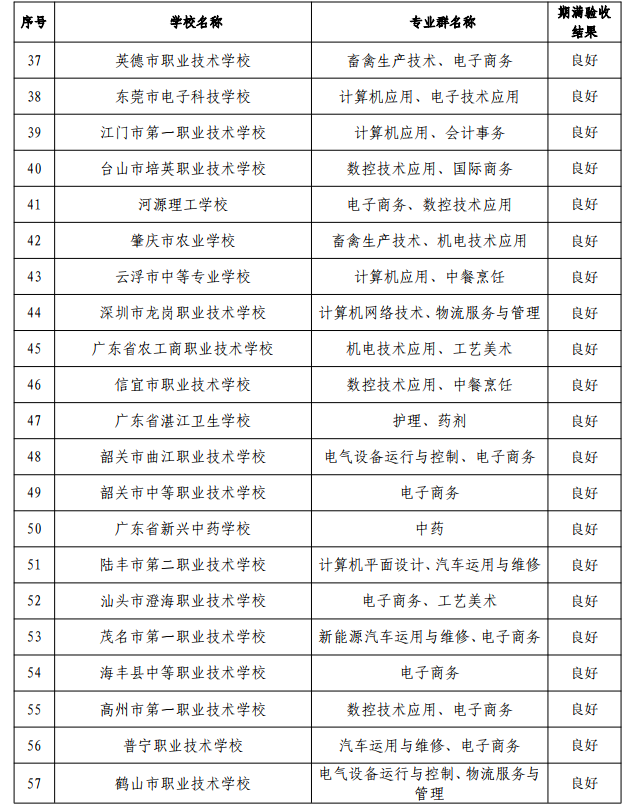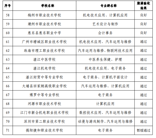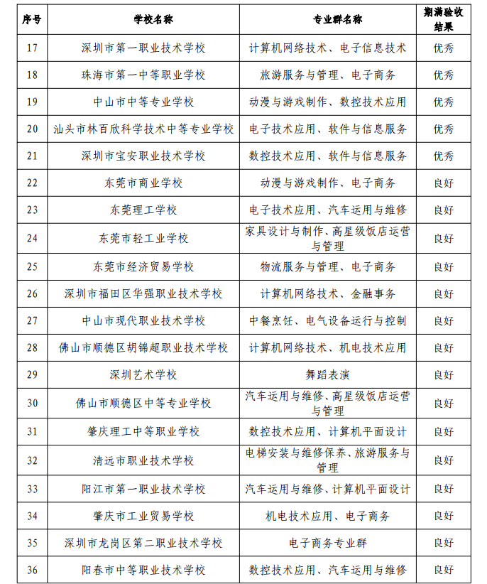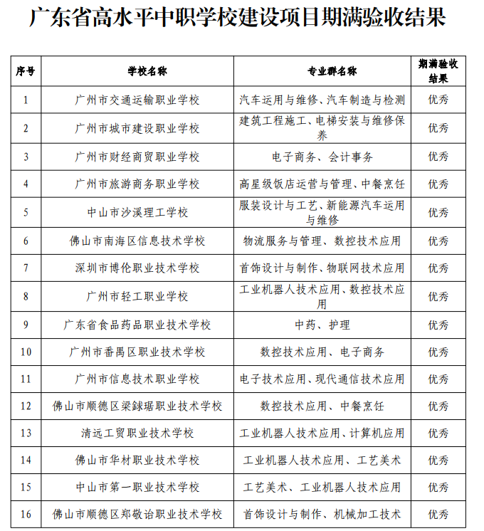6月30日,广东省教育厅发布《关于广东省高水平中职学校建设项目期满验收评审结果的公示》。根据公示结果,共有21所学校获评优秀(具体如图)。