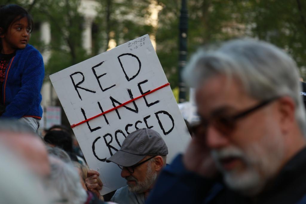 5月1日,人们手持标语在美国纽约参加抗议特朗普政府政策的集会和游行。新华社记者刘亚南摄