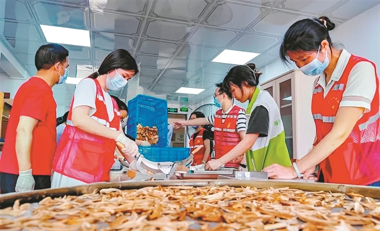 “小菇大业”赋能“百千万工程”,助村民撑开“致富伞”。距离大沙北社区40多公里的白云区钟落潭镇竹三村,同样是一派热火朝天的繁忙景象。时值初夏,竹三村赤灵芝种植基地迎来丰收。走进种植大棚,村民们正忙着采收、切片、晾晒。为帮助村民创业增收,竹三村创新“村—社—研—企”共建模式,联动企事业单位、科研院所,合力搭建产业平台,成立农业农民专业合作社,培育发展赤灵芝等食用菌产业。目前,“小菇大业”项目实现种植灵芝2000多株,创收近20万元,平均每户社员增收约5000元。