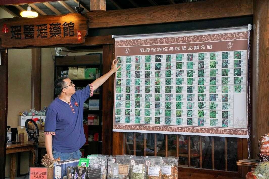 “‘十八钻’活血通络最是灵验!”雕子塘瑶医瑶药馆内,传承人江会荣轻抚自己的“宝贝药柜”,将瑶族“五虎九牛十八钻七十二风”的104味药材分类体系娓娓道来。药杵叮咚声中,团队成员凝神记录,仿佛触摸到瑶族祖先与草木对话的密码。另外一家老药铺里,瑶族草药店主赵秋香指尖翻飞,演示着瑶药炮制古法——鲜叶经九蒸九晒,方成治疾良品。
