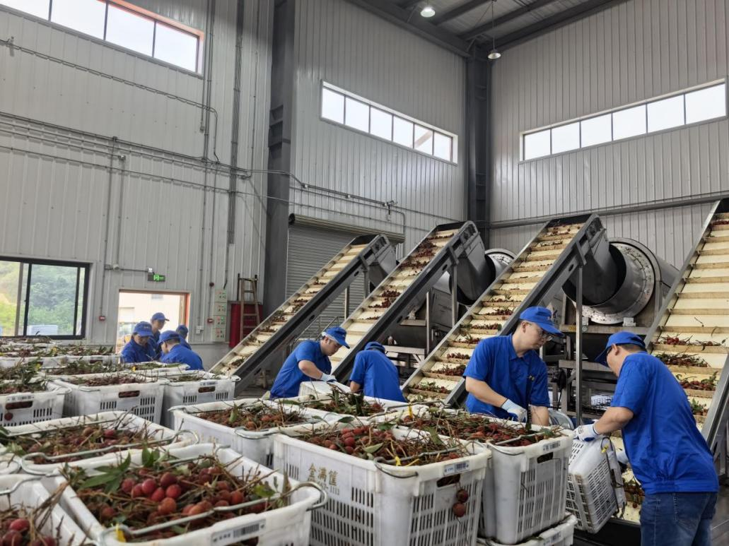 从6月初起,一筐筐荔枝鲜果,每日从田间地头被快速分拣、装车,源源不断地运往一个地方——广药王老吉广东荔枝(茂名)产业园。该产业园于2022年投产,集荔枝精深加工与产业带动于一体,堪称产业升级的“硬核引擎”。这里是全国最大的荔枝饮料生产基地,拥有全国唯一能加工荔枝清汁的生产线,同时也是国内最先进、单线产能最大、自动化程度最高的荔枝榨汁生产线,灌装生产线年规划产能900万箱。