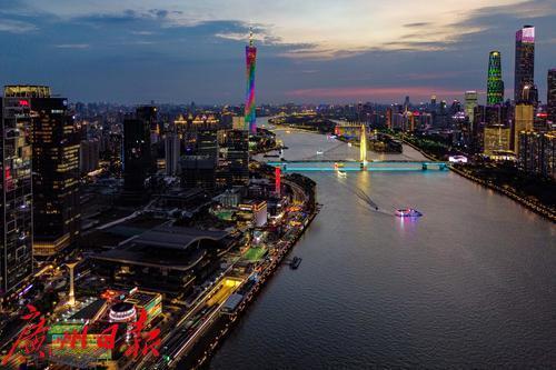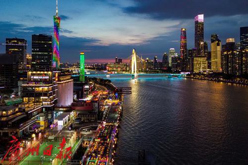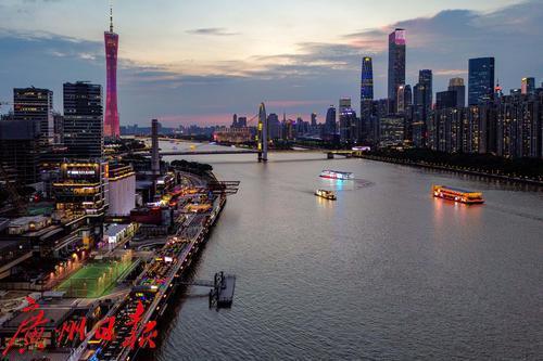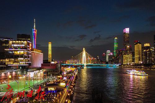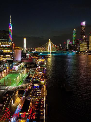 夜色中,游船在珠江上驶过,人们在琶醍消费、运动,远处的新中轴线灯火辉煌,广州的夜经济、夜生活由此体现。
