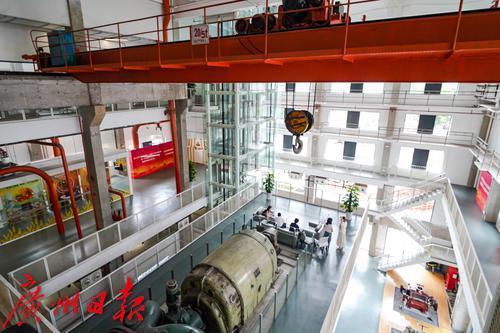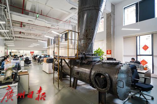 在珠江啤酒总部的办公大楼内,原珠江啤酒厂保留下来的煤斗给煤机、桥式起重机、汽轮发电机等“钢铁大侠”,与办公格子间、笔记本电脑、打印机相映成趣,让工业历史遗存与现代信息工具在同一空间内实现了“对话”。