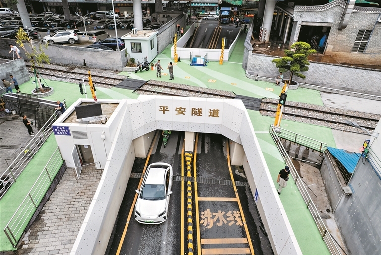 如今,平安隧道升级改造工程及隧道上方空间的亮化、美化等精细化微改造工程已经完工。记者在现场看到,隧道内原有的人行道及栏杆已被拆除,机动车道拓宽后,车辆经过隧道时不再小心翼翼。在涵洞入口处两边,各有一条人行道通向涵洞上方,实现人车分流,方便居民往来。