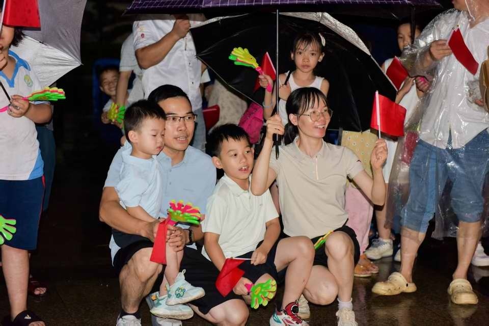 夜幕降临,雨后清新,桂头镇文化广场上早已人头攒动,热闹非凡。随着铿锵有力的鼓点响起,开场鼓乐表演瞬间点燃全场气氛。鼓手们身着鲜艳服装,用灵动的身姿和饱满的热情,台下观众纷纷挥手应和,齐声跟唱,炽热的氛围划破寂静夜空。广东外语外贸大学校友歌手独唱的《再一次出发》,以清亮激昂的嗓音传递出桂头镇以更加坚定的信念踏上新征程、迈向新辉煌。