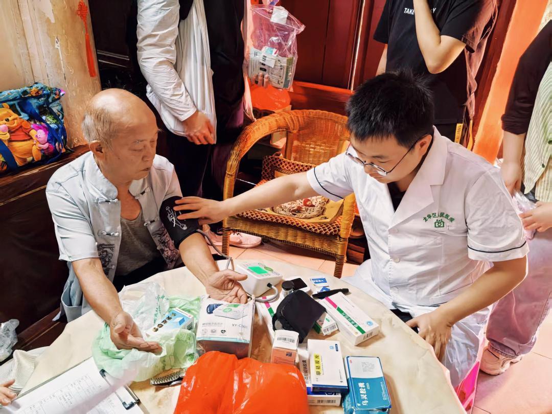 团队成员兵分三路,每组由1名医生、6-7名学生和1名街道人员组成,深入社区,为10位长期服药的留守老人开展药箱入户服务。在老人家中,学生协助老人整理现有药品,按照药箱分格存放,确保药品分类清晰、便于取用。医生则重点检查老人的药品是否过期、剂量是否合理,并为老人进行健康评估,提供个性化的用药建议。