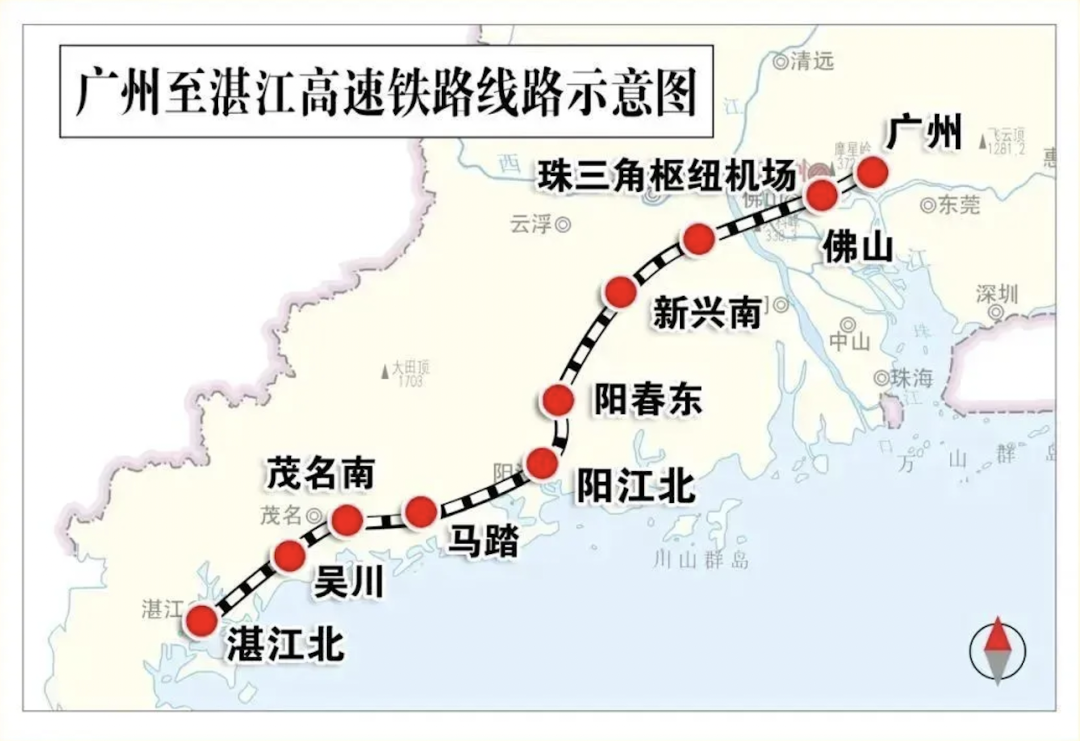 广湛高铁起于广州站,终至湛江北站,全线设12座车站,是国家“八纵八横”高速铁路网、时速350公里沿海铁路客运大通道的重要组成部分,同时也是广东省自主投资建设技术最复杂、线路最长、投资最大的铁路项目,是连接粤港澳大湾区和海南自贸港、北部湾城市群的高速铁路。