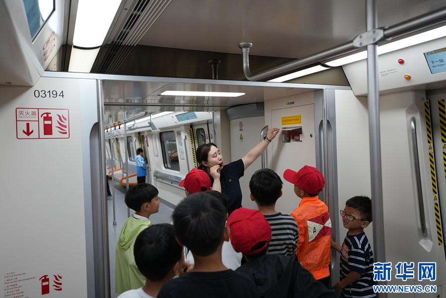 5月25日,郑州地铁3号线,工作人员在为孩子们讲解地铁安全知识。(李世伟 摄)
