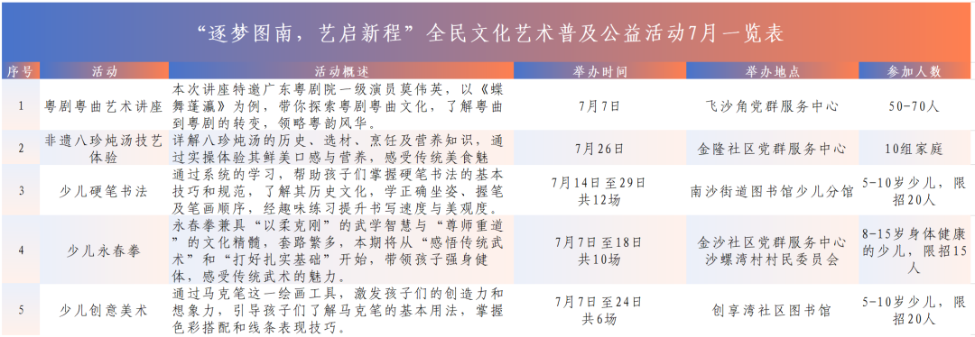 为进一步激发群众对文化艺术的兴趣,提升全民文化素养,南沙街道将于7月—8月开展“逐梦图南,艺启新程”2025年全民文化艺术普及公益活动,针对不同年龄段群众,开展多元精彩的文化艺术活动,探源传统,用艺术点亮盛夏时光。