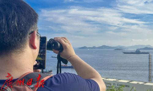 一位市民用手机和望远镜搭配拍摄山东舰。