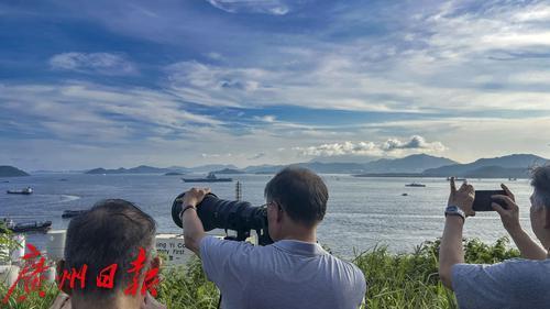 7月3日,航空母舰山东舰抵达香港,不少香港市民来到距离军舰停泊点最近的青衣西南端海边公路处围观这艘国之重器并拍照打卡。