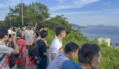众多香港市民来到青衣这段海边公路尽量可以近距离观看山东舰。