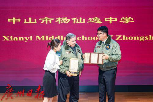 中山市杨仙逸中学接受飞虎队友谊学校授牌,并向杰夫·格林赠礼。