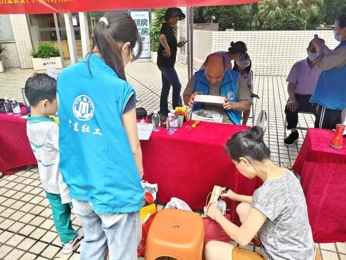 便民服务区域为居民提供电蚊拍、电风扇、电饭煲等小家电免费维修及保养咨询;理发师志愿者在义剪区为居民提供理发服务;艾灸、口腔义诊摊位则专注健康咨询与诊疗。