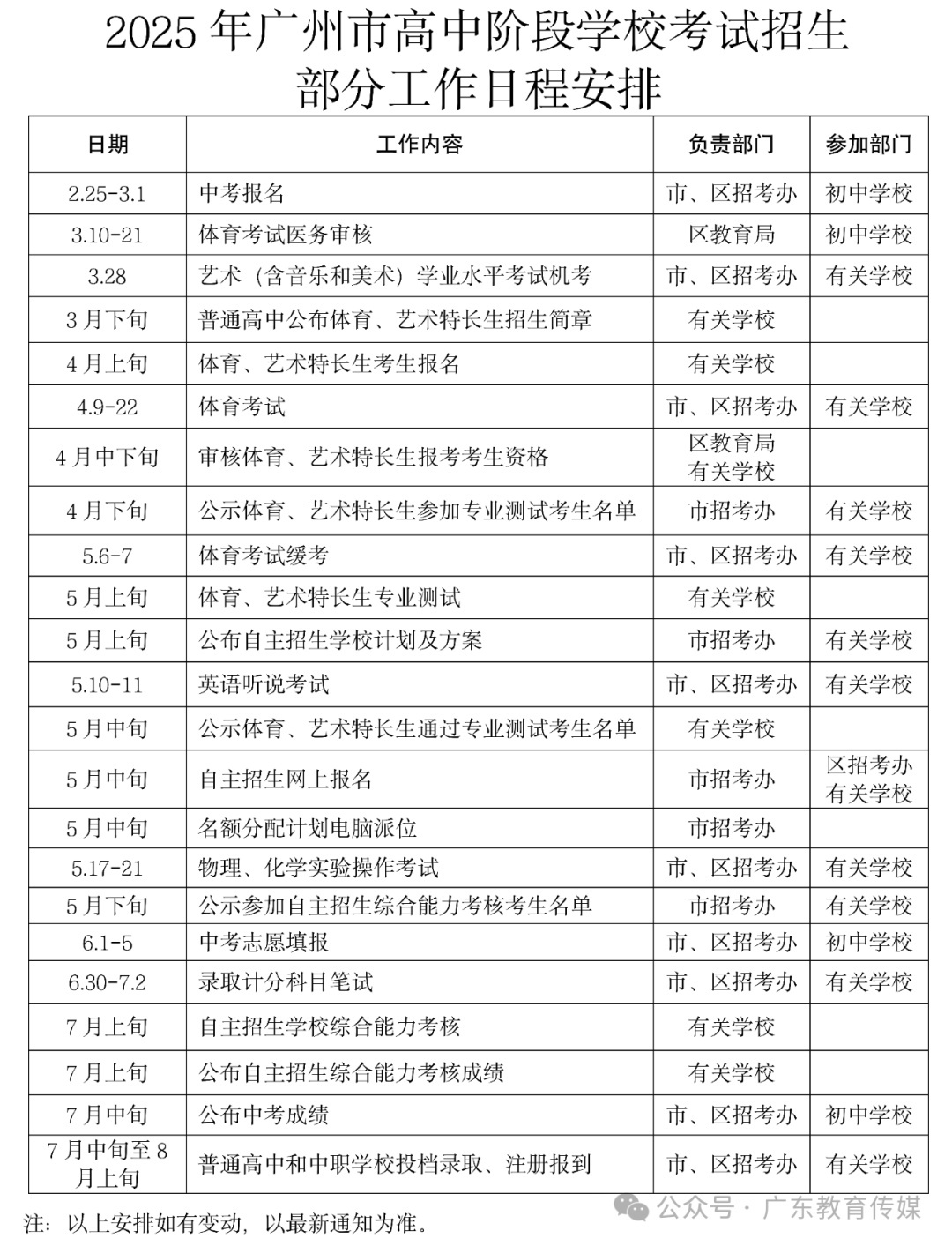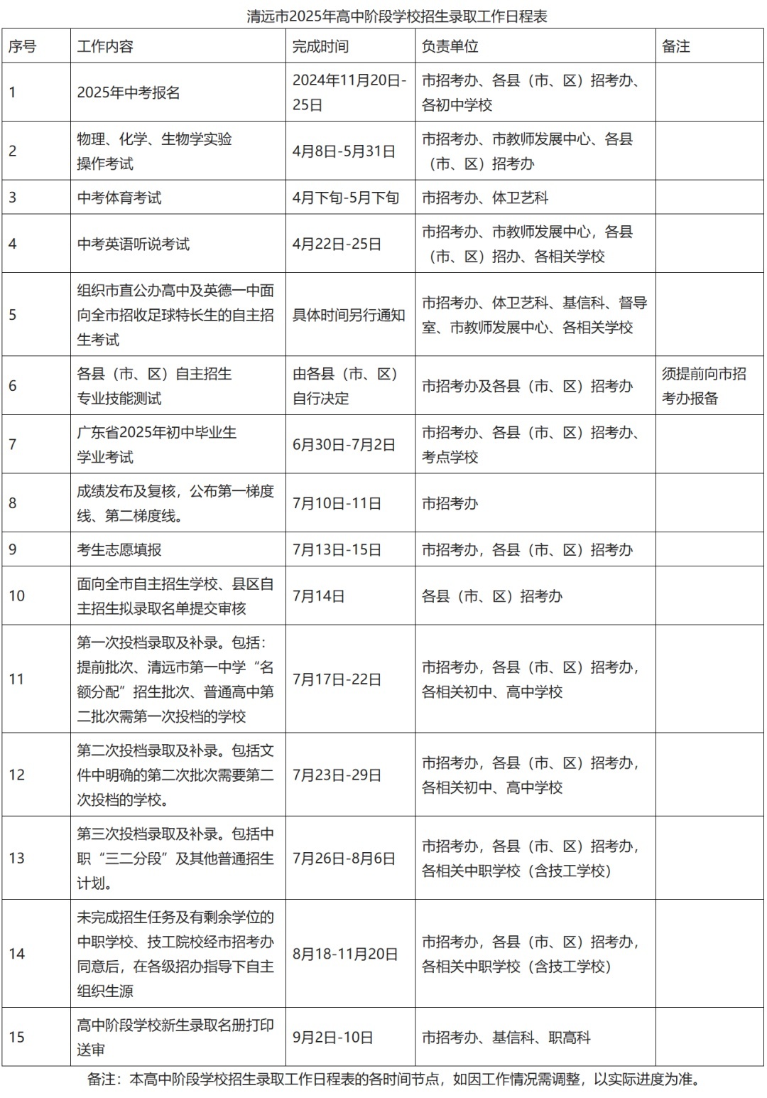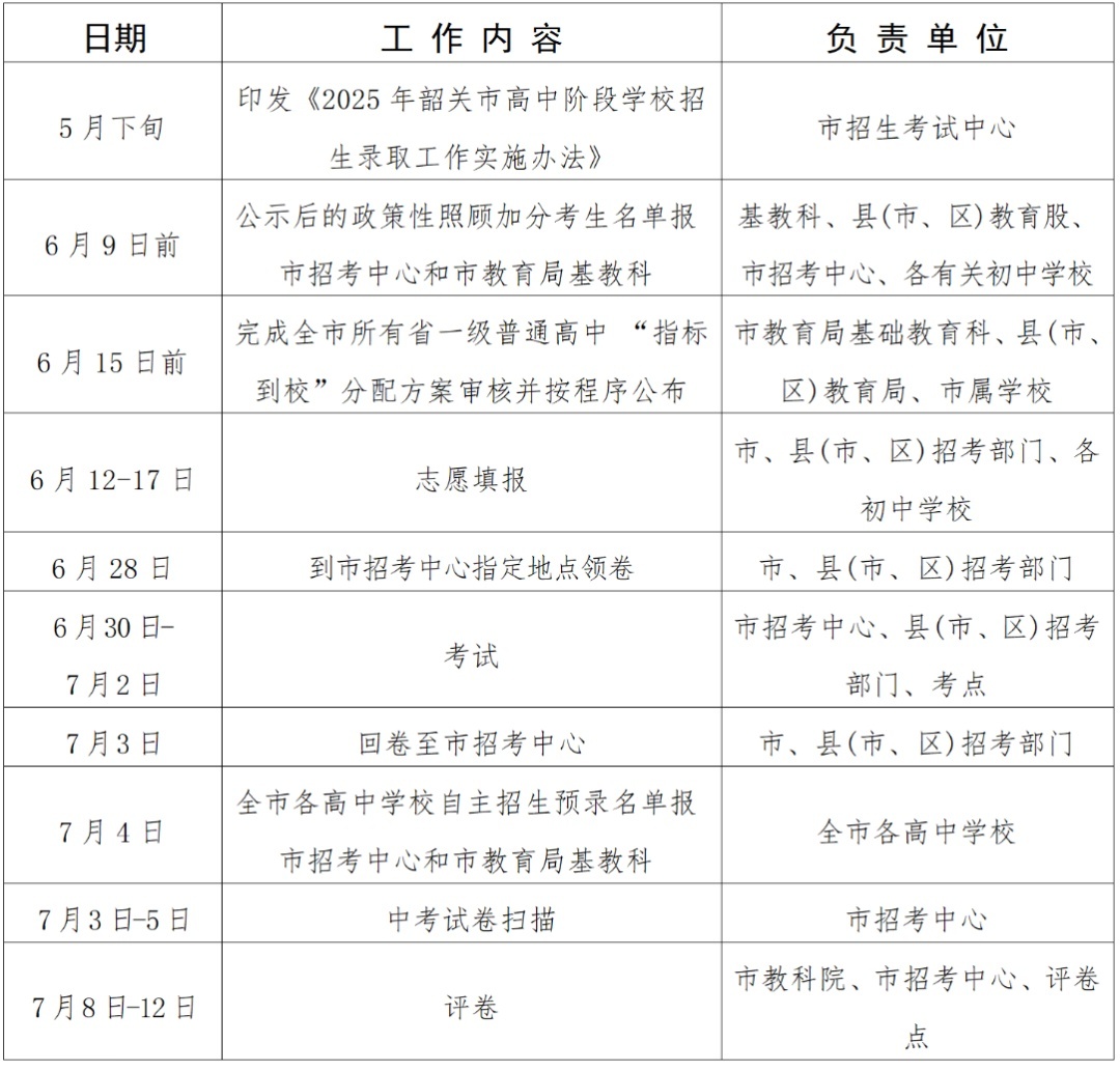韶关市教育局同日印发的《2025年韶关市高中阶段学校招生录取工作实施办法》显示,7月16日公布中考成绩、7月19日起开始普高录取,日程安排如下: