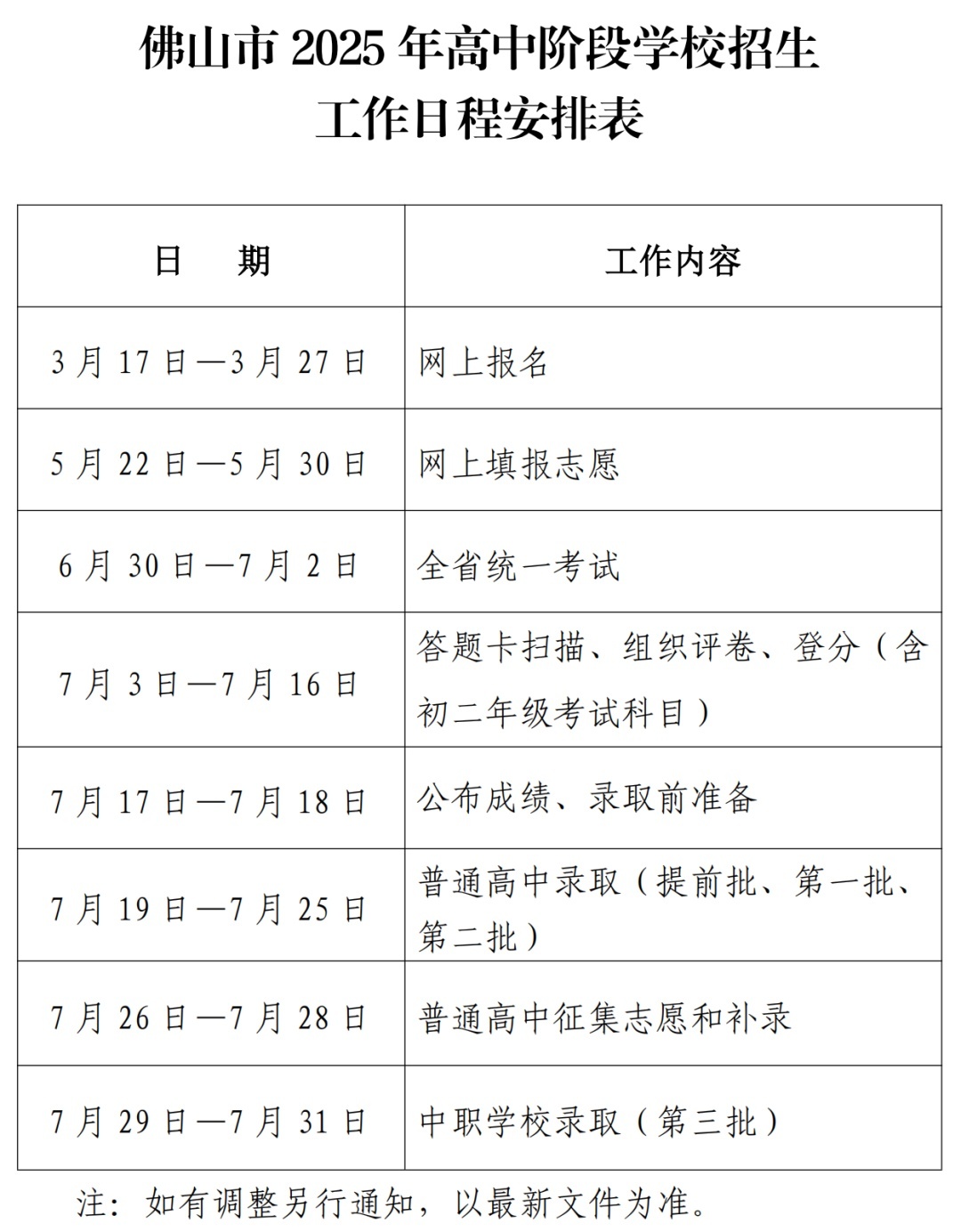 根据佛山市教育局印发的《2025年高中阶段学校招生考试工作意见》,7月17日-18日公布成绩及录取前准备、7月19日开始进行录取。