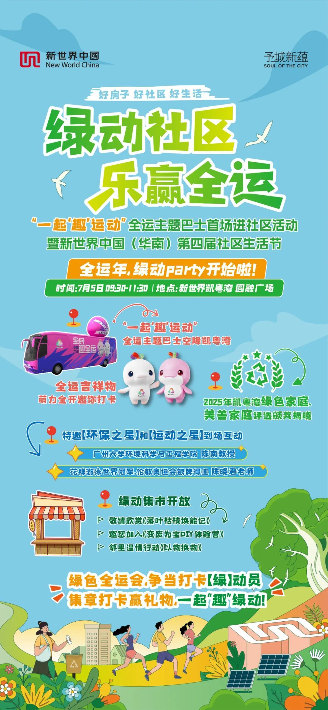 为迎接2025全运年,助力“全民迎全运”主题宣传活动进社区,由荔湾区新时代文明实践中心、石围塘街道新时代文明实践所 、信息时报社、新世界中国联合举办的 “绿动社区 乐赢全运”——“一起‘趣’运动”全运主题巴士首场进社区活动暨新世界中国(华南)第四届社区生活节,将于7月5日在荔湾区新世界凯粤湾社区活力启航。