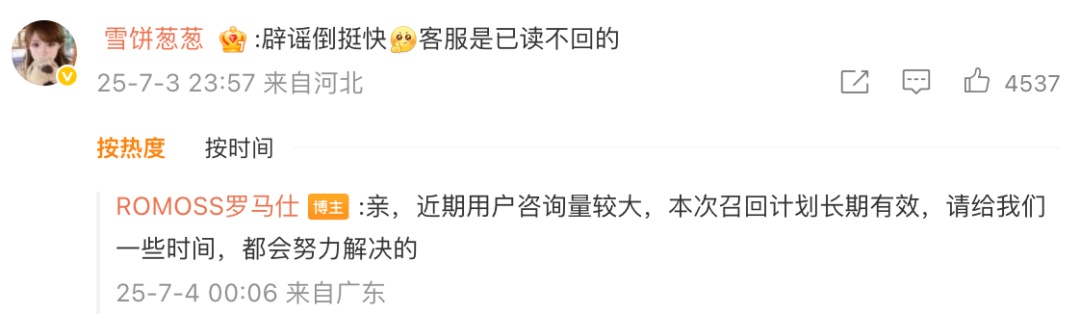 此外,针对网友提出的“客服已读不回”问题,罗马仕也进行了回答:近期用户咨询量较大,本次召回计划长期有效,请给我们一些时间,都会努力解决的。