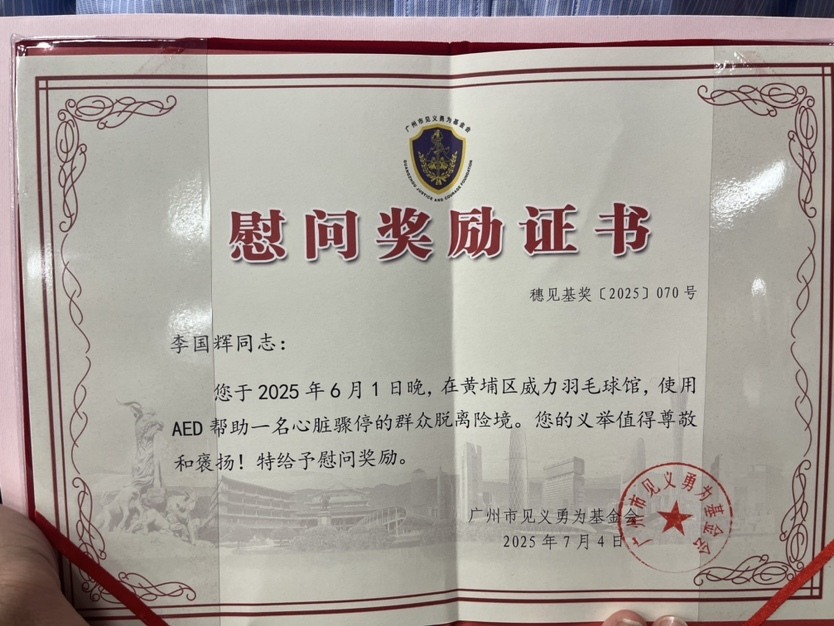 今年6月1日晚,一场惊心动魄的生命救援在黄埔区威力羽毛球馆上演。彼时,广州市东升医院ICU医生李国辉用专业与担当,使用球馆配备的AED,成功从死神手中夺回一条鲜活生命。
