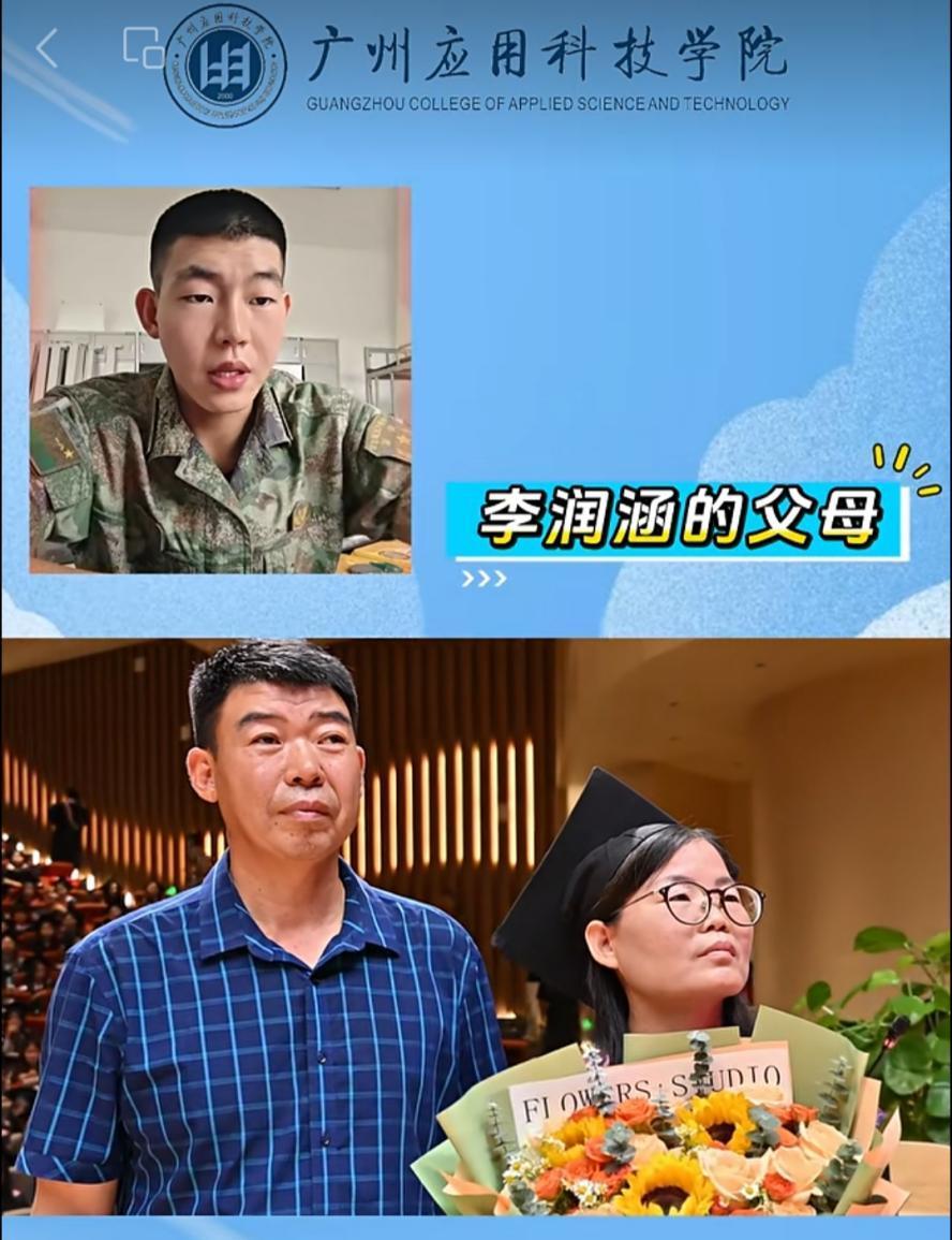 广州应用科技学院毕业典礼上出现了一位“特殊嘉宾”。2025届毕业生李润涵因春季应征入伍驻守新疆,无法返校参加毕业典礼。学校特邀李润涵母亲身着学士服,代表儿子登台,校长亲自为李润涵母亲正冠拨穗。
