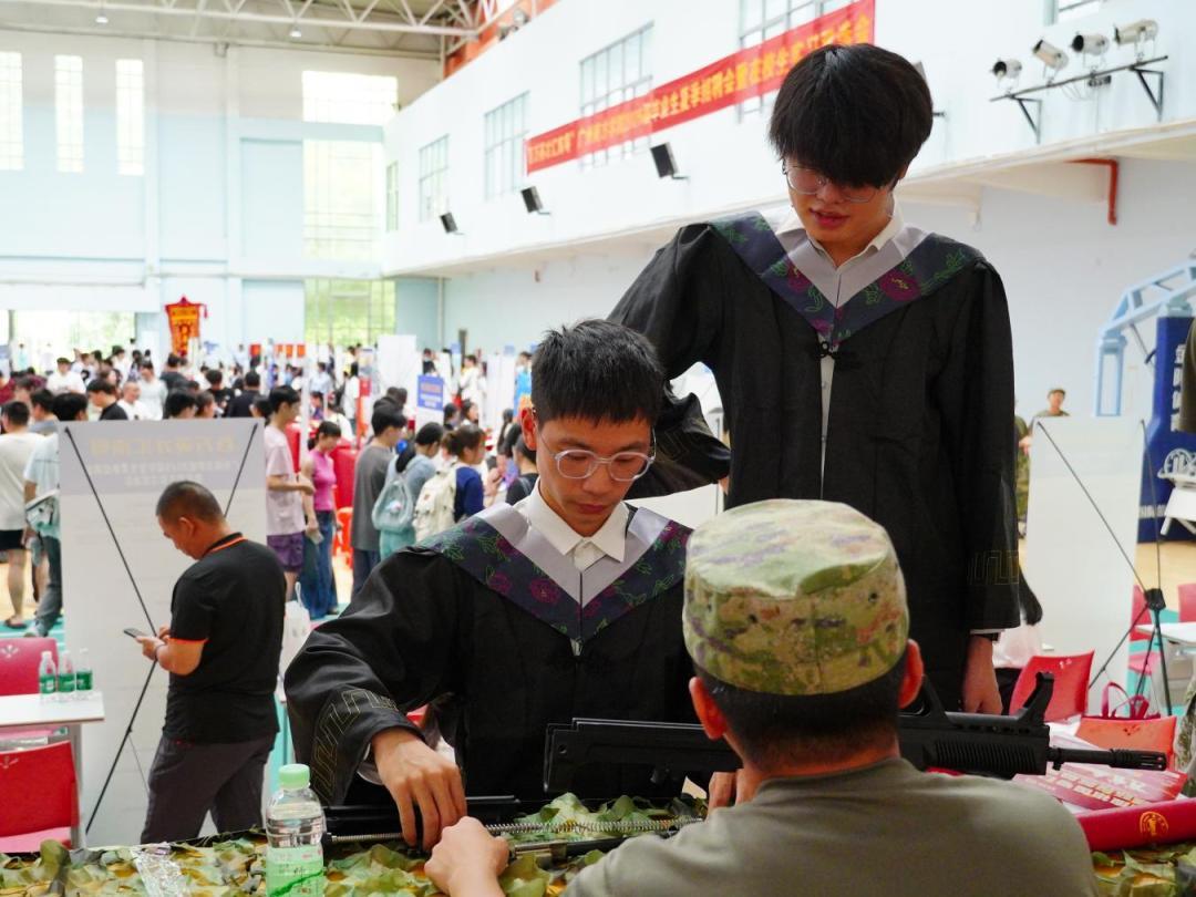“我从小就向往军营,如今了解到部队为大学生提供的广阔发展平台,更加坚定了我的选择。”广州华立学院2025届毕业生张再鹏现场提交了预征报名表。为增强感染力,活动还设置95式自动步枪模拟射击体验、枪械分解结合等环节,让青年学子近距离感受军营氛围。