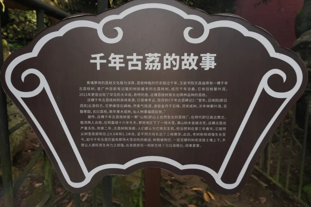 在古树旁,一方现代立下的《千年古荔碑记》记载一则传说:“昔年,吕纯阳云游四方,见萝峰怪石嶙峋,紫气隐透,遂投金丹于石缝,须臾成树,次年枝繁叶茂,花馥果甜,名曰荔枝,数年果木成林,仙人种果福荫后世。”据相关部门的测量倒推,这棵古树种于公元1001年,它比其栖息地——广州现存最早的书院玉喦书院还要早近百年。