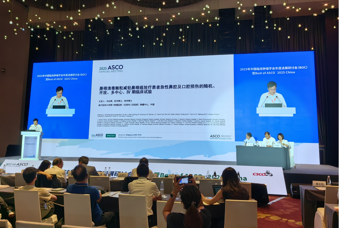 由项目组核心成员、南方医科大学第十附属医院(东莞市人民医院)肿瘤中心主任刘志刚教授领衔的《鼻咽清毒颗粒减轻鼻咽癌放疗患者急性鼻腔和口腔损伤的IV期临床研究》ASCO数据在2025年BOC/BOA大会头颈肿瘤专场进行国内首次公开。