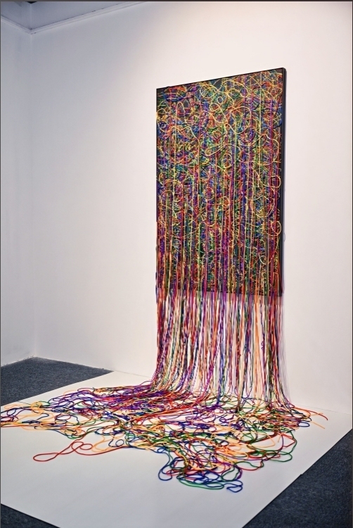 周艺文最新推出的《被困扰的哲学》是他对精神世界与现实世界的双重批判,既有热烈的隐喻,又有疯狂的想象。 他创造了线的哲学,他创造了架上绘画与空间的生长性互文关系,他创造了一个奇异的当代艺术场景。 在周艺文这里不再是传统的架上绘画,画中的线条吐出来延伸到地面,周艺文把人脑的思维轨迹具象化,他创造了一个线的流动的盛宴。 通过雕塑与纤维装置艺术作品《被困扰的文艺复兴》《沉睡的蒙娜丽莎》,周艺文在现实语境下试图重构欧洲文艺复兴,他的作品具有鲜明的文献意义、历史与时间感。
