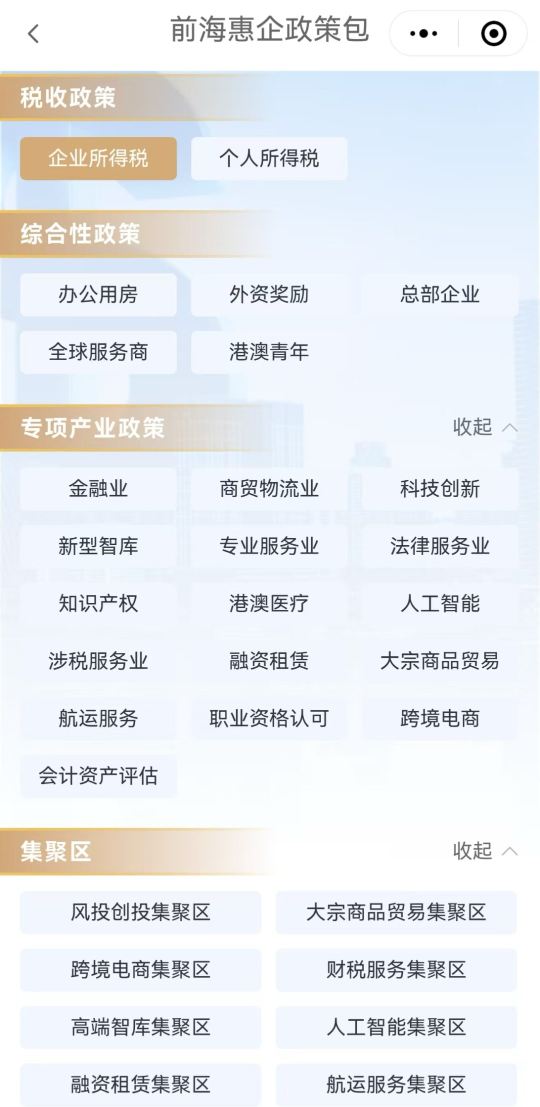 前海还有一揽子惠企扶持政策,包括但不限于金融业、法律服务业、商贸物流业、科技创新、总部企业、港澳青年就业创业、港澳医疗、人工智能、跨境电商、新型智库、知识产权等。详情可登录小程序“i前海”“前海企业服务一体化平台”进行查询。