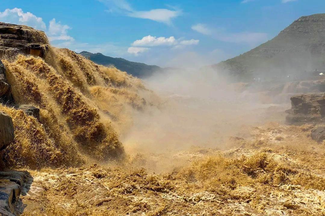 从空中俯瞰,奔腾的河水如同脱缰之马,呼啸而下,主副瀑布携手倾泻,再现壮美金黄色瀑布群,出现水岸齐平、金涛拍岸的壮美景观,再现“90版50人民币”壮阔取景瀑布,正式进入今年最佳观赏期。