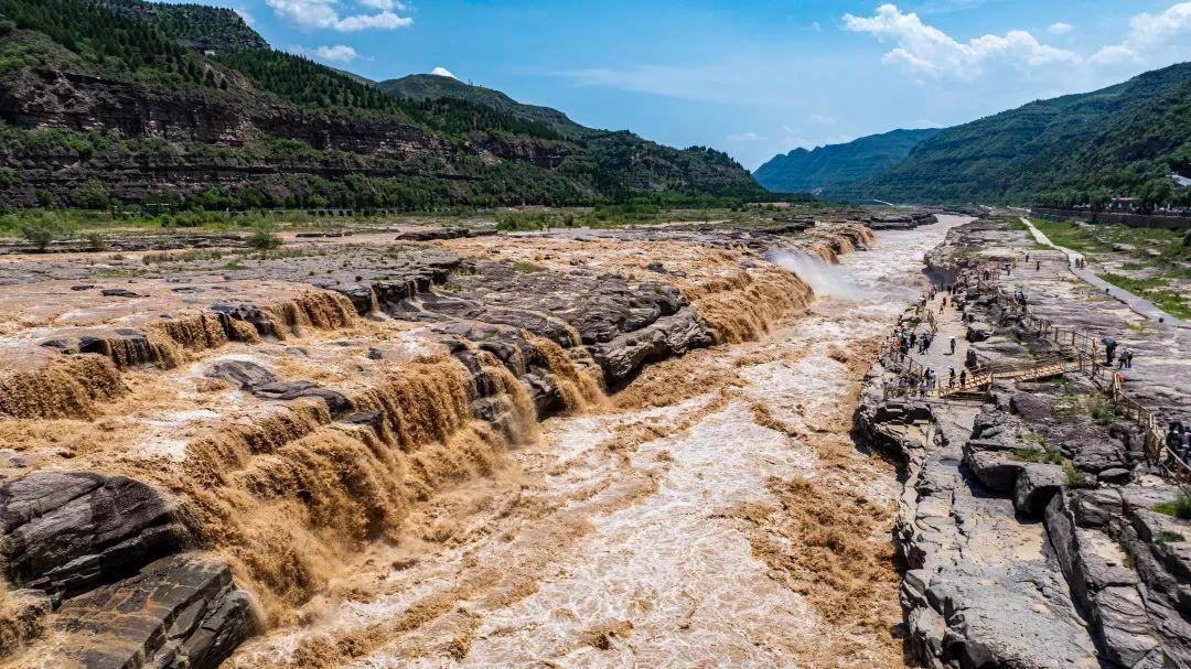 黄河水犹如一条黄色的巨龙,裹挟着雷霆万钧之势,自秦晋大峡谷间奔涌而来,山岩与激流碰撞,苍翠与金黄交织,绘就一幅磅礴的夏日画卷。