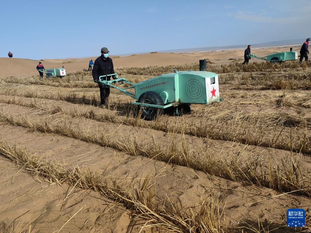 工人利用压沙机进行压沙障作业。新华社记者李云平 摄