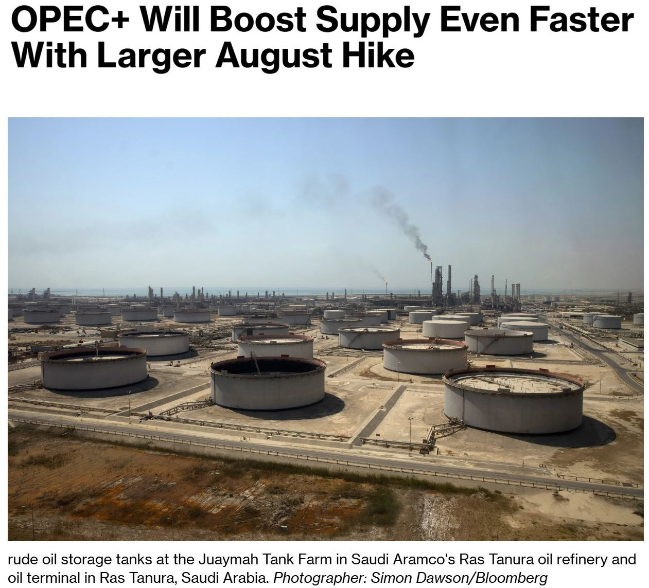 当地时间5日,由石油输出国组织(欧佩克)和非欧佩克产油国组成的“欧佩克+”部分成员国举行线上会议,最终,与会的沙特阿拉伯、俄罗斯、伊拉克、阿联酋、科威特、哈萨克斯坦、阿尔及利亚和阿曼的代表决定,自8月起日均增产54.8万桶原油。